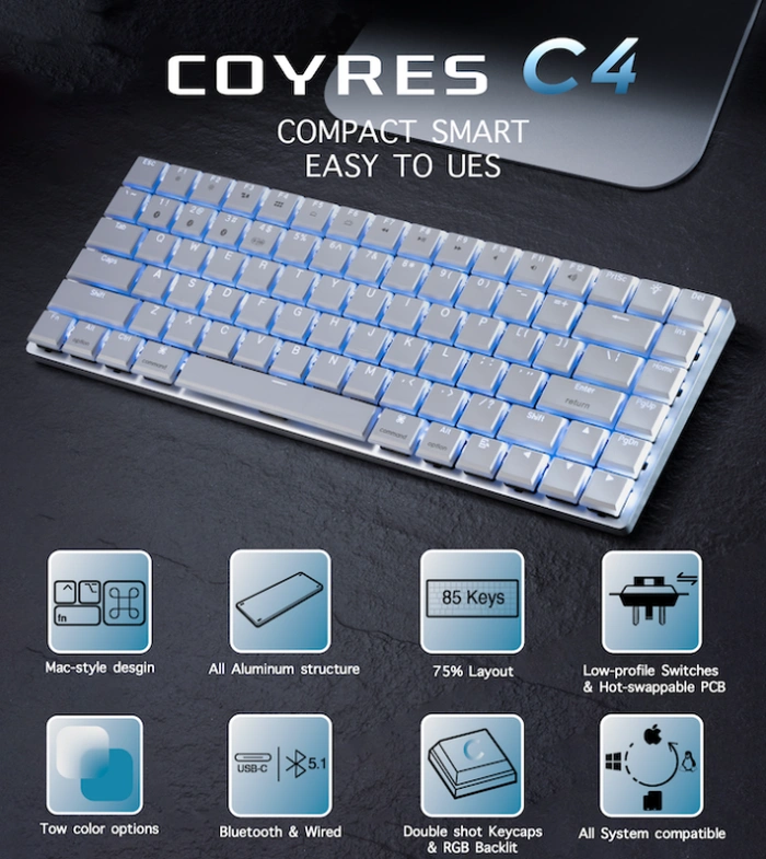 Wenn Sie auf der Suche nach einer neuen Tastatur sind, die mit Windows-, Mac-und Linux-Betriebssystemen kompatibel und von der Apple Magic-Tastatur inspiriert ist, könnten Sie an der neuen Crowdfunding-Kampagne für die Coyres C4 interessiert sein. Mit einem Layout von 75 % kann die Tastatur sowohl drahtlos als auch kabelgebunden verwendet werden und verfügt über Hot-Swap-Schalter und RGB-Hintergrundbeleuchtung.