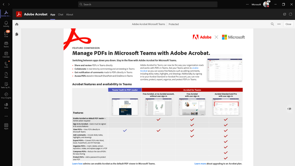 Zusätzlich hat Microsoft eine neue Adobe Acrobat-Integration veröffentlicht, mit der Benutzer die App als Standard-PDF-Erfahrung in Teams festlegen können. Diese Version soll dabei helfen, PDF-Dateien zu überprüfen, Kommentare und Anmerkungen hinzuzufügen und in Microsoft OneDrive und Microsoft SharePoint gespeicherte PDFs zu öffnen.