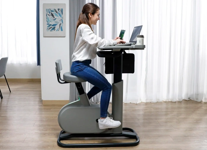 „Im Arbeitsmodus bewegt sich die Schreibtischoberfläche näher an den Stuhl heran um Fahrer beim Tippen und Treten in einer aufrechten Position sitzen zu lassen. Im Sportmodus sitzt die Tischplatte weiter vorne und bietet mehr Platz zum Anlehnen, ähnlich wie bei einem Standardfahrrad oder-trainer, für mehr Beinfreiheit und mehr Tretkraft. Das durchdachte Design ermöglicht es Benutzern, die Ausfallzeiten zwischen den Arbeitsperioden zu nutzen, um Energie zu behalten und auf kleinem Raum etwas Sport zu treiben. Fahrer können dann nahtlos in den Arbeitsmodus zurückkehren, indem sie einfach die Schreibtischoberfläche zurück in ihre ursprüngliche Position schieben.“