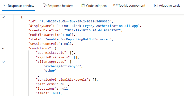Um verschiedene Arten von Richtlinien für bedingten Zugriff zu erstellen, lernen Sie auf einfache Weise, wie man sie strukturiert, indem Sie sie im Microsoft Graph Explorer-Tool anzeigen. Wie zuvor wird dadurch die Richtlinie für den bedingten Zugriff mit den definierten Einstellungen erstellt.