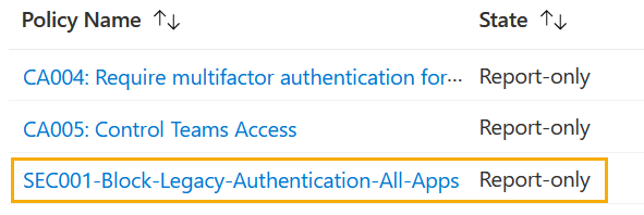 $Params=@{ DisplayName=”SEC001-Block-Legacy-Authentication-All-App”; State=”EnabledForReportingButNotEnforced”; Bedingungen=$bedingungen; GrantControls=$grantcontrols; } New-MgIdentityConditionalAccessPolicy @Params