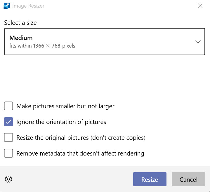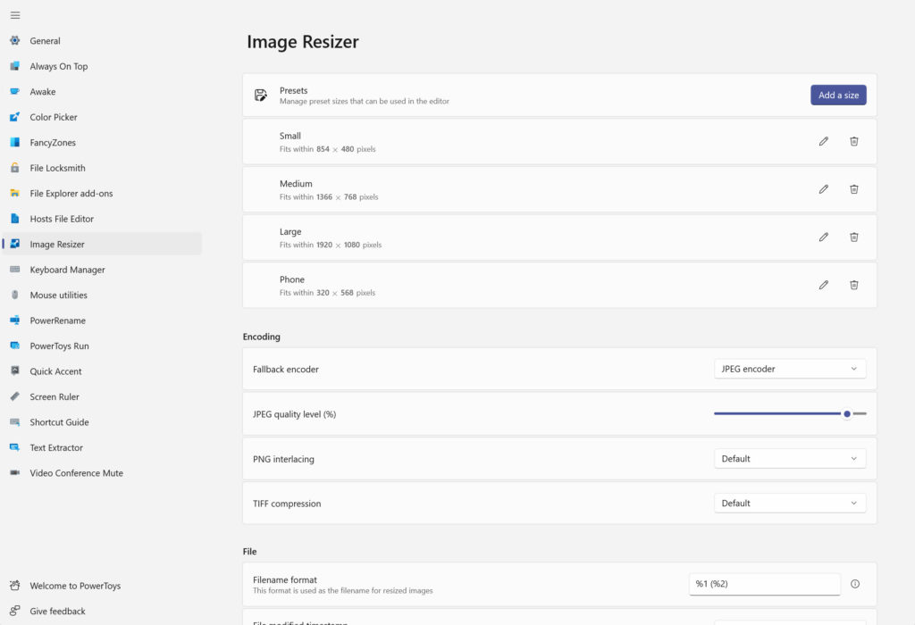 Sie Wählen Sie dann aus einer Liste vordefinierter Größen und klicken Sie auf OK. Sie können Ihre eigenen Größenoptionen in der PowerToys-App definieren und die Codierungsqualität konfigurieren. Es ist schneller und einfacher, als Ihren Bildeditor zu öffnen.