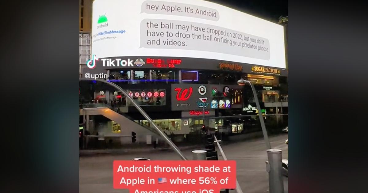 Google hat während der CES 2023 eine große Anzeige im Harmon Corner in Las Vegas geschaltet, um Apple erneut aufzufordern, das RCS-Nachrichtenprotokoll für seine Nachrichten-App zu übernehmen.