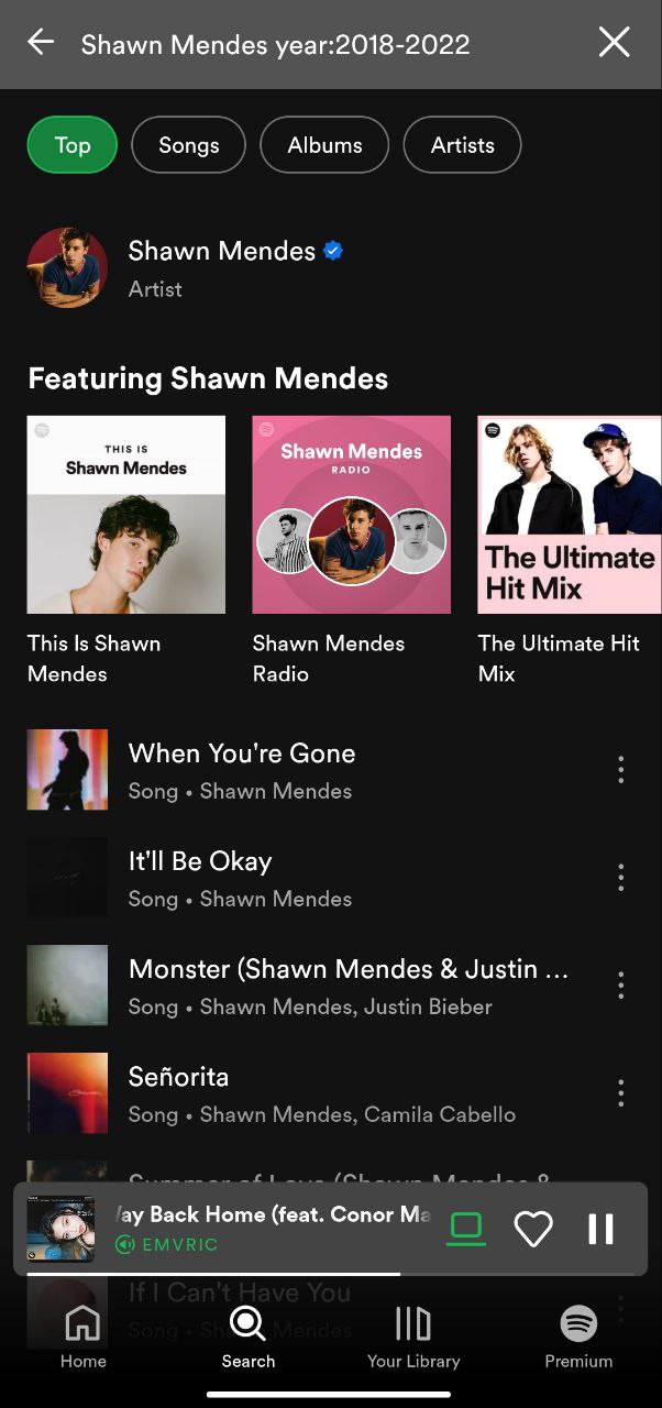 Eine Band oder ein Musiker durchläuft während seiner Karriere viele Phasen, von denen einige zwangsläufig besser sind als andere. Sie können alle unvergesslichen Jahre umgehen, indem Sie den Suchparameter „Jahr“ auf Spotify verwenden. Daher zeigt Ihnen Spotify nur Songs von Shawn Mendes aus den „Jahren 2018-2022“, wenn Sie nach ihm suchen und den Suchmodifikator hinzufügen.