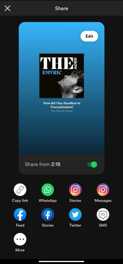 Mit dieser Funktion können Sie ganz einfach a Teilen Sie Ihren Freunden einen bestimmten Teil des Spotify-Podcasts mit und lassen Sie sie diesen Teil anhören, wenn sie auf den Link klicken. Solch ein wunderbares Feature.