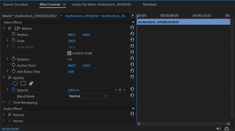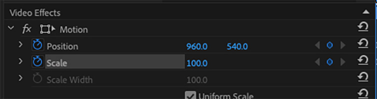Um den Keyframing-Vorgang zu starten, klicken Sie auf das Stoppuhr-Symbol neben Skalierung und Position. Die Stoppuhr wird blau, wenn Keyframing aktiviert ist. Jetzt werden alle Anpassungen, die Sie innerhalb von Skalierung und Position vornehmen, in diesem ersten Keyframe aufgezeichnet.