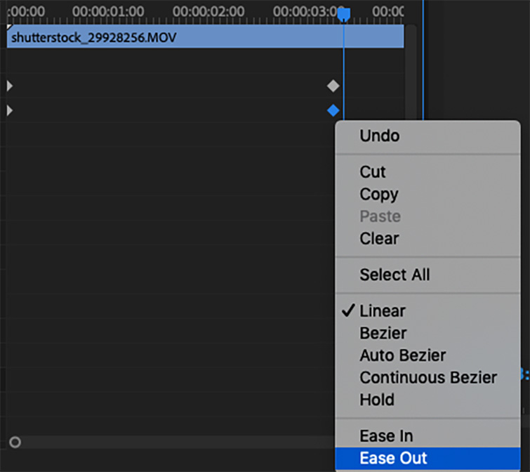 Wenn Sie Ihre Animation durchgespielt haben und die Bewegung zu linear erscheint, gibt es ein perfektes Werkzeug, um die Bewegung weicher erscheinen zu lassen. Um diese direkt zu aktivieren, klicken Sie auf das Keyframe-Symbol im Bedienfeld „Effekte“. Wählen Sie dann Nachlassen für den Beginn der Bewegung und Nachlassen für das Ende.