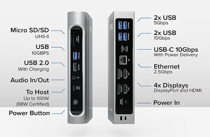 – 100 W Power Delivery – Halten Sie Ihren Laptop den ganzen Tag mit 100 W (98 W zertifiziert) Power Delivery aufgeladen. Und wenn Ihr Computer weniger Strom benötigt, passt sich die Dockingstation automatisch an. 2 USB-Anschlüsse können zum Aufladen von Peripheriegeräten wie Telefonen und Tablets verwendet werden
