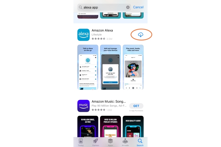 Find the app named “Amazon Alexa” from the list. Tippen Sie auf den Namen und wählen Sie dann die blaue Wolke oder die Schaltfläche „Abrufen“, um die App auf Ihr Telefon herunterzuladen.