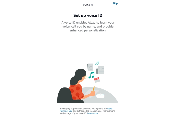 After confirming your name, the next screen will ask you to set up your Voice ID. Sie haben zwei Möglichkeiten zu reagieren: entweder überspringen und später einrichten oder im Moment einrichten. Wenn Sie fertig sind, wählen Sie „Meine Funktionen einrichten“, um die wichtigen Alexa-Einstellungen anzuwenden, z. B. das Einrichten Ihrer Kontakte zum Tätigen von Anrufen und zum Senden von Textnachrichten. Finally, select “Done.”