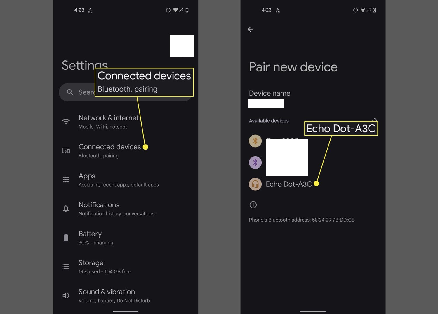Choose the Echo device. Tippen Sie abschließend auf Bluetooth, um alle zum Koppeln verfügbaren Geräte anzuzeigen. Suchen Sie den Namen Ihres Echo-Geräts und tippen Sie darauf, um es zu koppeln. Und du bist fertig!