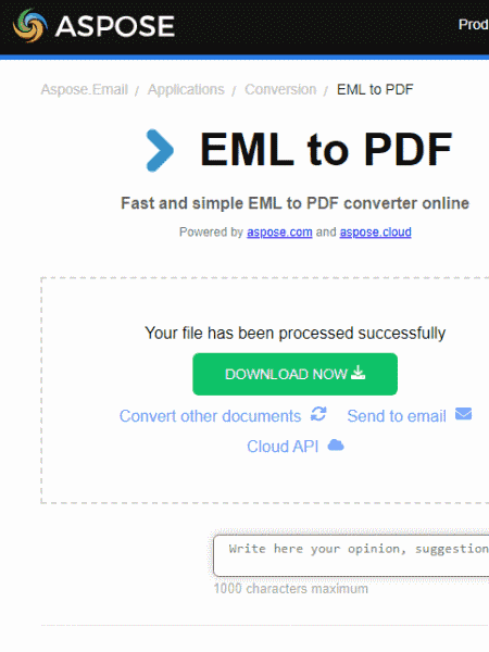 Aspose bietet eine kostenlose Online EML-zu-PDF-Konverter, den Sie kostenlos verwenden können. Für diese spezielle Konvertierung kann der Konverter bis zu 10 Dateien pro Konvertierung konvertieren. Sie können die Dateien aus dem lokalen Speicher hochladen. Diese Website unterstützt den Cloud-Import, jedoch nicht für diese Konvertierung. Nachdem Sie die Dateien hinzugefügt haben, können Sie sie in PDF-Dokumente konvertieren. Nach der Konvertierung können Sie die konvertierten Dateien direkt herunterladen. Außerdem haben Sie die Möglichkeit, die konvertierten Dateien per E-Mail zu versenden.