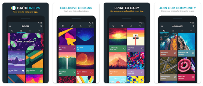 Wenn Sie nach verschiedenen Kategorien von Hintergrundbildern suchen, z. Materialien, minimal, Weltraum, abstrakt, Fotografie, geometrisch und so weiter, Sie finden sie alle auf Backdrops. Das einzige Problem mit dieser App ist, dass sie seit einiger Zeit nicht mehr aktualisiert wurde. Es ist also wahrscheinlich, dass Sie nicht die neuesten Hintergrundbilder erhalten, aber das schmälert nicht seinen Rang als eine der besten Live-Hintergrundbild-Wechsler-Apps da draußen.