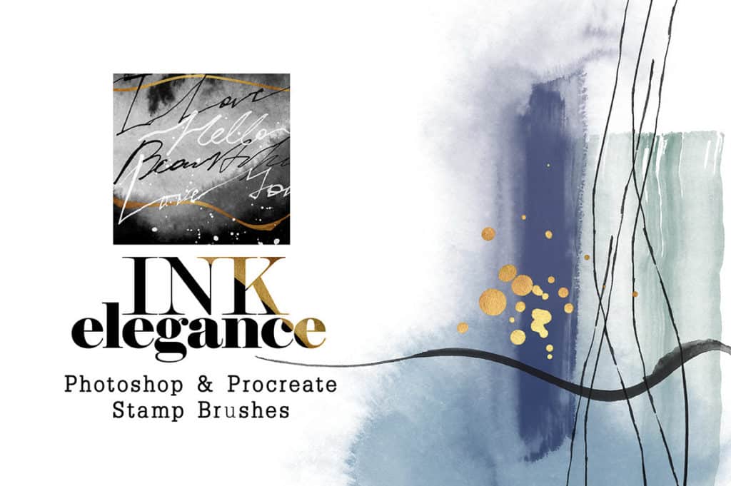 Suchen Sie ein professionelles Pinselset für den Druck von Produkten, Branding und Verpackungen? Dann sollten Sie sich Ink Elegance ansehen. Dieses Pinselpaket enthält eine Sammlung moderner Stempelpinsel. Es enthält 90 mit Tinte erstellte abstrakte Stempel, bestehend aus 30 Tintenlinien, 28 Hintergrundabstrichen, 16 Sprühtexturen und 16 handschriftlichen Sätzen. Außerdem erhalten Sie 20 goldene Flecken und einen Photoshop-Ebenenstil mit goldener Textur.