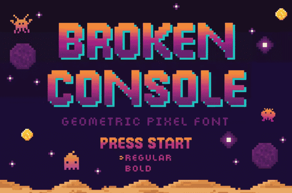 Broken Console ist eine geometrische Pixelschrift, die von der Spielkonsole der alten Schule inspiriert wurde. Die Charaktere haben eine Spielansicht und sehen aus wie Pixelkunst. Es gibt sie in drei Stilen, nämlich Regular, Bold und Shadow.