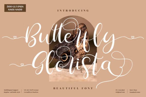 Diese Schmetterlingsschrift hat stilistische Alternativen im OpenType-Format, Ligaturen, Symbole und Satzzeichen. Diese Schriftart wird von Programmen wie Adobe Photoshop, Illustrator, InDesign und Microsoft Word unterstützt.