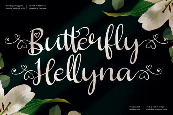 Die Butterfly Hellyna ist eine formale Schriftart. Diese schick aussehende Schriftart eignet sich für Speisekarten, Broschüren, Hochzeitseinladungen, Branding und ist perfekt für Social-Media-Posts. Diese Schmetterlingsschrift enthält Sonderzeichen, Satzzeichen und Zahlen.