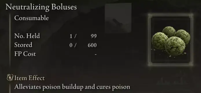 Erforderliche Gegenstände: Die erforderlichen Gegenstände zur Herstellung dieses Rezepts sind 1 Giftpilz und 1 Giftblüte. Verwendung: Dieses Rezept ist nützlich, um den Feinden Giftschaden zuzufügen. Ort des Rezepts: Schließlich kann dieses Rezept erhalten werden, indem das Kochbuch des nomadischen Kriegers (Nr. 14) freigeschaltet wird. Dieses Rezept kann sich auf einer Leiche in der Nähe der schwelenden Kirche (Nordostecke – Limgrave) befinden.