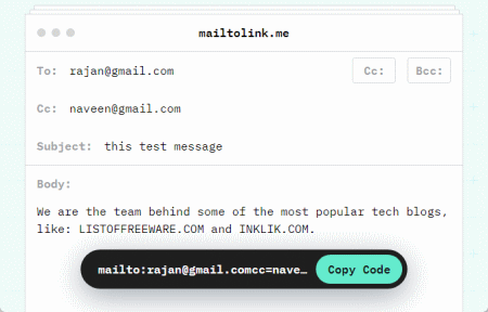 Mailtolink.me ist ein kostenloses Online-Mailto-Link-Generator-Tool. Dieses Tool bietet Ihnen eine schnelle Möglichkeit, Markup für Mailto-Links zu generieren. Es hat eine saubere Benutzeroberfläche mit Unterstützung für ein dunkles Thema. Das Tool bietet ein E-Mail-Format, in dem Sie Ihre E-Mail-Details direkt hinzufügen können. Dazu gehören Empfänger, CC, BCC, Betreff und Text. Während Sie die Informationen eingeben, wird sofort eine Schaltfläche zum Kopieren des Codes dafür angezeigt. Auf diese Weise können Sie den mailto-Link erhalten und auf Ihren Webseiten implementieren.