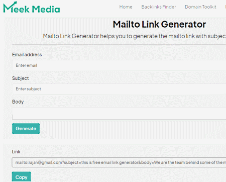 Meek.media hat ein kostenloses Tool, um einen Mailto-Link online zu generieren. Dies ist ein einfaches Werkzeug, mit dem Sie einen Empfänger, einen Betreff und eine Nachricht hinzufügen können. Es enthält keine Cc und Bcc in der Mail. Sie können diese drei Informationen in das Tool einfügen und dann den Link generieren. Es zeigt den Link in einem Textfeld darunter, das auch eine Schaltfläche zum Kopieren des Links hat. Von dort aus können Sie den Mailto-Link abrufen.