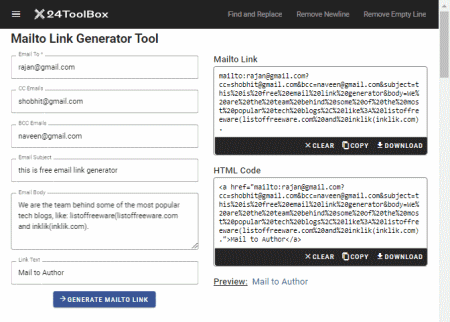 24Toolbox.com hat ein kostenloses Online-Mailto-Link-Generator-Tool. Das Tool hat eine minimalistische Oberfläche mit allen Optionen, die Sie sich in einer solchen E-Mail wünschen würden. Sie können einfach die Details ausfüllen, die Sie in die E-Mail aufnehmen möchten. Daneben können Sie auch einen Linktext hinzufügen, wenn Sie möchten. Dieses Tool generiert den mailto-Link mit Ihrer Eingabe. Es gibt Ihnen auch den HTML-Code dafür. Der HTML-Code enthält auch den Linktext (falls hinzugefügt).