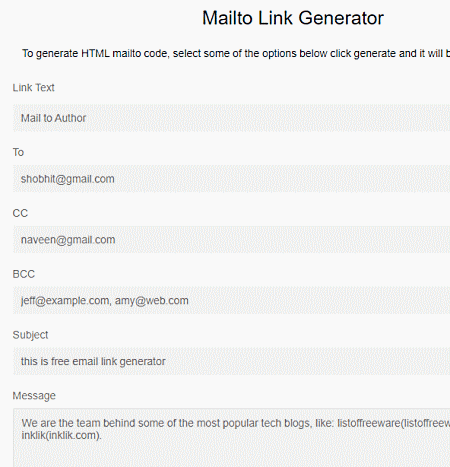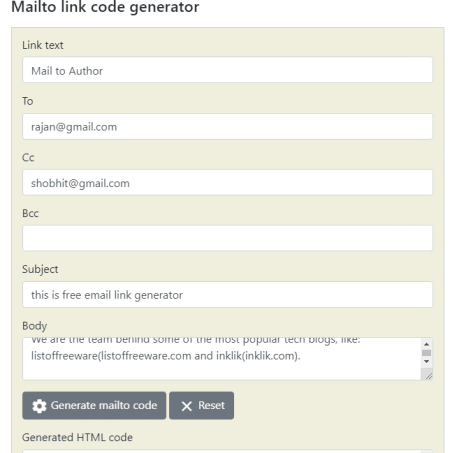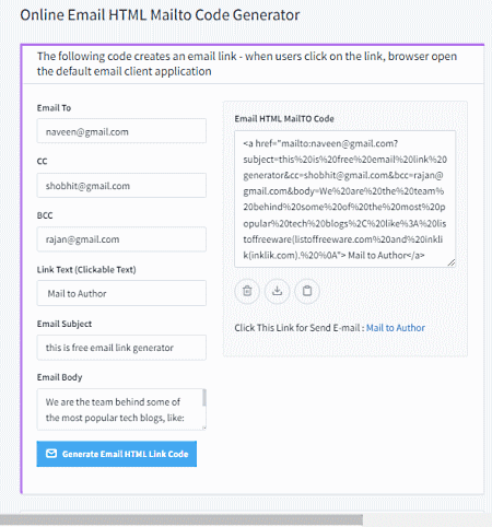 GeneratorMix.com bietet ein kostenloses Online-Mailto-Link-Generator-Tool. Mit diesem Tool können Sie einen Mailto-Link-Code mit Empfänger, CC, BCC, Betreff und Text generieren. Dieses Tool gibt den Code in HTML aus und hat auch einen Abschnitt zum Hinzufügen von Linktext. Sie können einfach die Informationen hinzufügen und erhalten den Code dafür. Da HTML den Mailto-Link im Kontext enthält, können Sie auch nur einen Mailto-Link erhalten.
