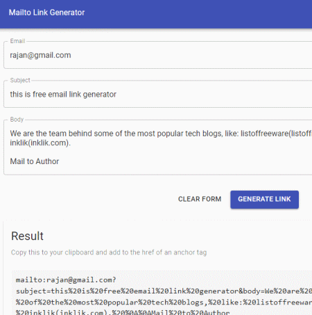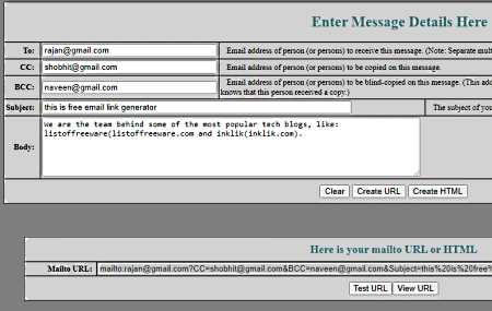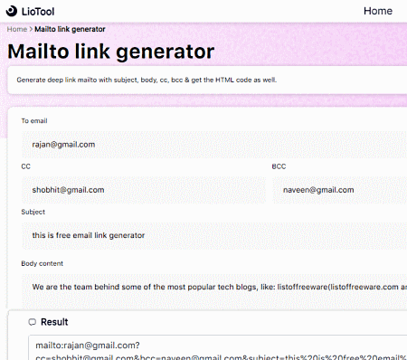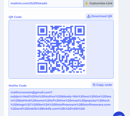 Mjurnal.com hat ein kostenloses Online-Mailto-Link-Generator-Tool. Dieses Tool generiert Mailto-Links, QR-Codes und HTML-Codes. Sie müssen lediglich Ihre E-Mail-Nachricht zusammen mit der E-Mail-Adresse des Empfängers zum Tool hinzufügen. Sie können bei Bedarf alle Cc und Bcc hinzufügen. Damit generiert es die Mailto-Links. Es listet alle drei Links namentlich auf (Link, QR, HTML). Sie können den gewünschten Like-Typ auswählen und von dort abrufen.