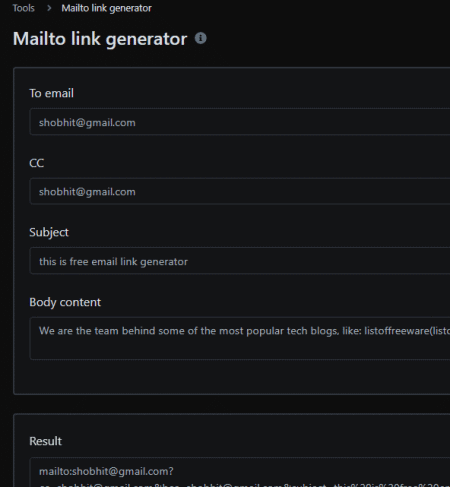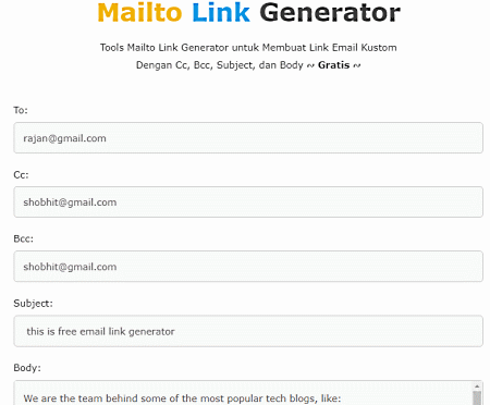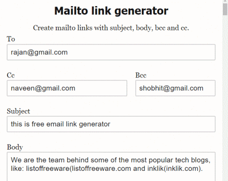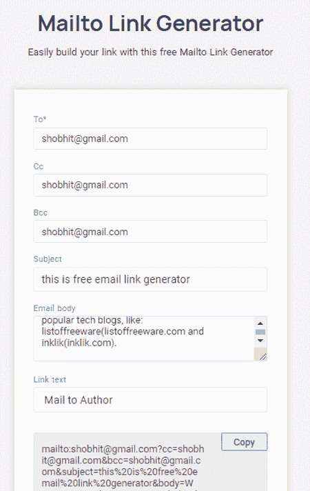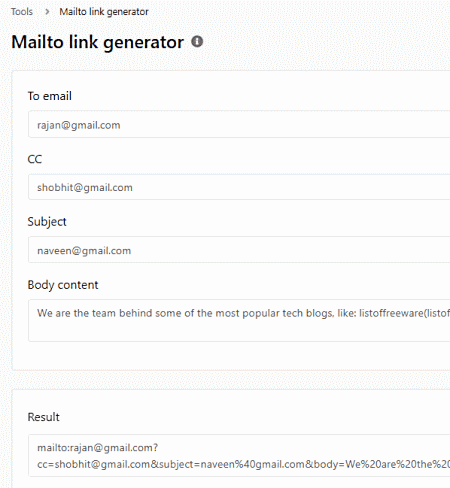 FreeNerdTools.com bietet ein einfaches Online-Mailto-Link-Generator-Tool. Dieses Tool zeigt das E-Mail-Nachrichtenformat auf dem Bildschirm an und deckt auch CC und BCC ab. Sie können die entsprechenden Informationen direkt im Layout hinzufügen. Wenn Sie die Informationen hinzufügen, wird sofort der Mailto-Link darunter generiert und aktualisiert. Wenn Sie mit der Eingabe fertig sind, können Sie einfach den Mailto-Link von dort kopieren.