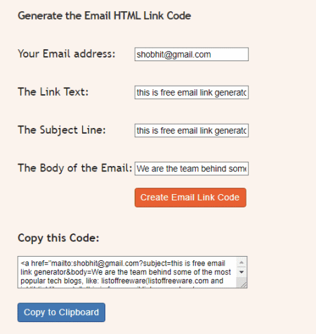 TextFixer.com bietet auch ein kostenloses Online-Tool zum Online-Generieren von E-Mail-Link-Codes. Dieses Tool generiert den E-Mail-Link-Code im HTML-Format. Um den Code zu generieren, enthält er Abschnitte für die E-Mail-Adresse, den Linktext, die Betreffzeile und den Text der E-Mail. Sie können diese Informationen einfach zum Tool hinzufügen, um den Code zu erhalten. Da es sich um einen HTML-Code handelt, kann er einen anklickbaren Text anzeigen, der den eigentlichen Link maskiert. Wenn Sie den mailto-Link benötigen, können Sie diesen aus dem HTML-Code kopieren.