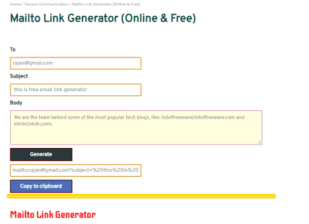 Gehen Sie zu diesem Online-Tool, indem Sie den unten angegebenen Link verwenden. Geben Sie Ihre E-Mail-Details im Format ein. Klicken Sie dann auf die Schaltfläche Link generieren, um den Code zu erhalten.