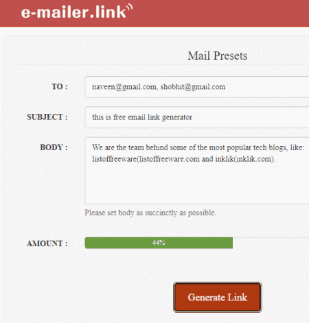 Öffnen Sie dieses Online-Tool mit dem unten angegebenen Link. Fügen Sie Ihre E-Mail-Details im Format hinzu. Klicken Sie danach auf die Schaltfläche Link generieren, um den Code zu erhalten.