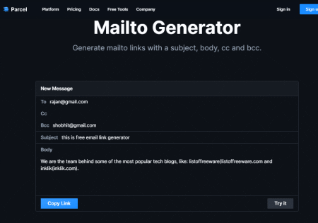 Parcel.io hat ein kostenloses Online-Mailto-Link-Generator-Tool. Mit diesem einfachen Tool können Sie Mailto-Links mit Betreff, Text, Cc und Bcc generieren. Es hat einen Abschnitt „Neue Nachricht“, in dem Sie eine E-Mail mit allen Details verfassen können. Danach können Sie einfach den Link kopieren, um den Code zu erhalten. Dieses Tool hat auch eine „Try it“-Schaltfläche, mit der Sie den mailto-Link testen können. Es repliziert das Verhalten, wie es für die Benutzer funktionieren würde.