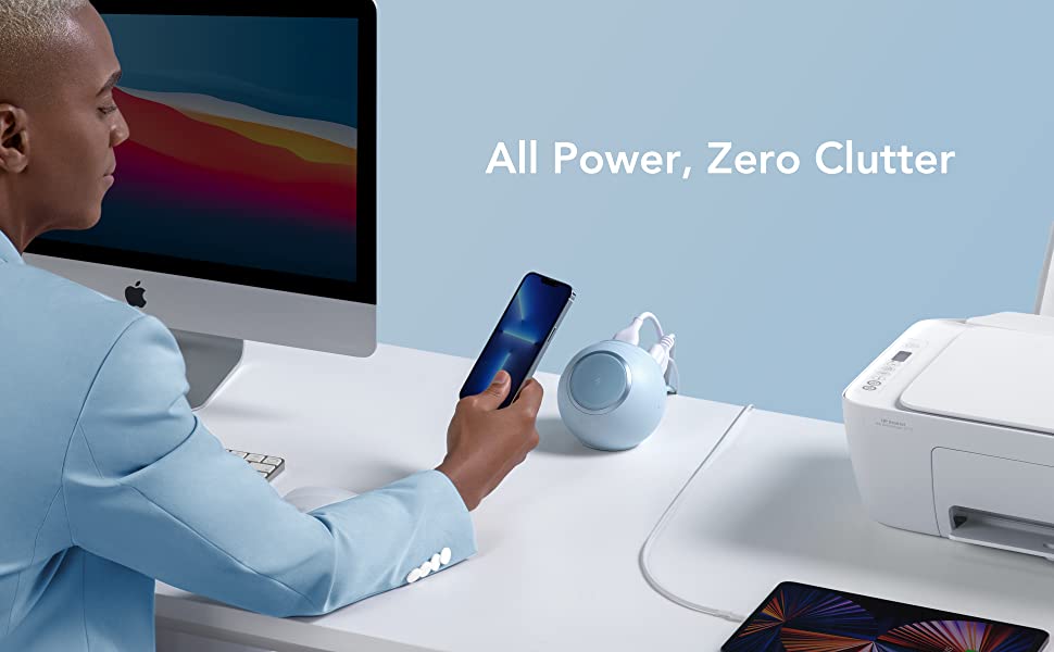 Schnappen Sie Ihr iPhone 14 magnetisch an Ort und Stelle, um ein sicheres und müheloses kabelloses Laden zu genießen. Der MagGo 637 verfügt über ein integriertes magnetisches Ladepad, zwei USB-C-Anschlüsse, zwei USB-A-Anschlüsse und drei Wechselstromanschlüsse auf der Rückseite. Schließen Sie es an einen der beiden USB-C-Anschlüsse an, um Ihren Laptop mit 65 W aufzuladen, Tablets mit hoher Geschwindigkeit aufzuladen oder Ihr iPhone in nur 30 Minuten von 14 auf 50 % aufzuladen.