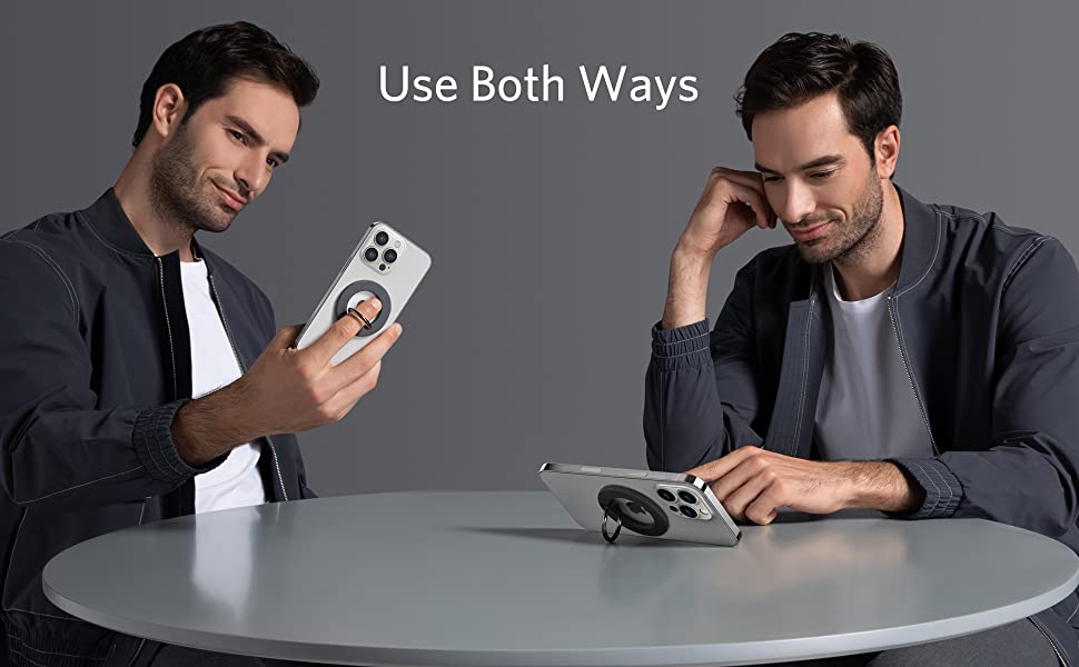Funktioniert einwandfrei als Griff für unterwegs oder als praktischer Ständer, wenn Sie es zum Scrollen, Fernsehen oder Chatten auf einen Schreibtisch stellen möchten. Der leichte Ringhalter mit starkem Magnetgriff sorgt dafür, dass er fest an Ihrem iPhone 14/13 haftet. Er ist so stark, dass er bis zu 800 g (28 oz) halten kann, was dem Gewicht von 4 iPhone 12 entspricht. Drehen Sie Ihren Ringhalter einfach um 360° und drehen Sie ihn um bis zu 125° für einen bequemen Halt oder verschiedene Betrachtungspositionen auf eine Tischplatte gestellt.