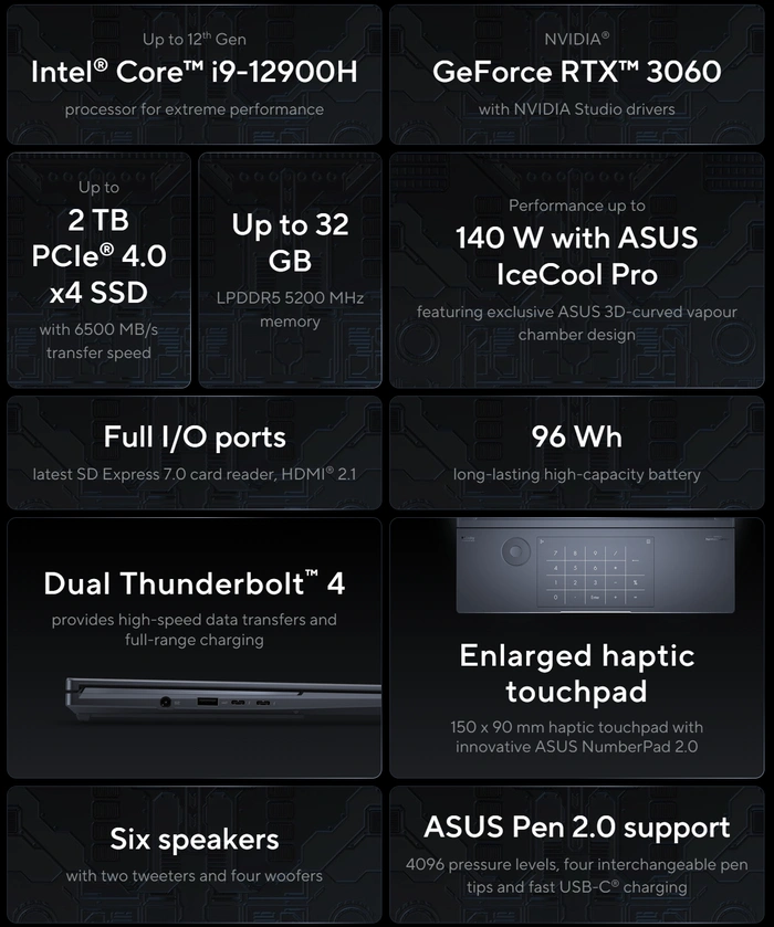 Zu den weiteren Merkmalen gehören 2 TB PCIe 4.0 x 4 SSD mit a 6500 MB/s Übertragungsgeschwindigkeit in einem eleganten, 16,9 mm dünnen und 2,4 kg leichten Gehäuse mit vollständigen E/A-Anschlüssen, einschließlich des neuesten SD Express 7.0-Kartenlesers, HDMI 2.1, zwei Thunderbolt 4-Steckplätzen und einer langlebigen Leistung von 96 Wh-Akkukapazität.