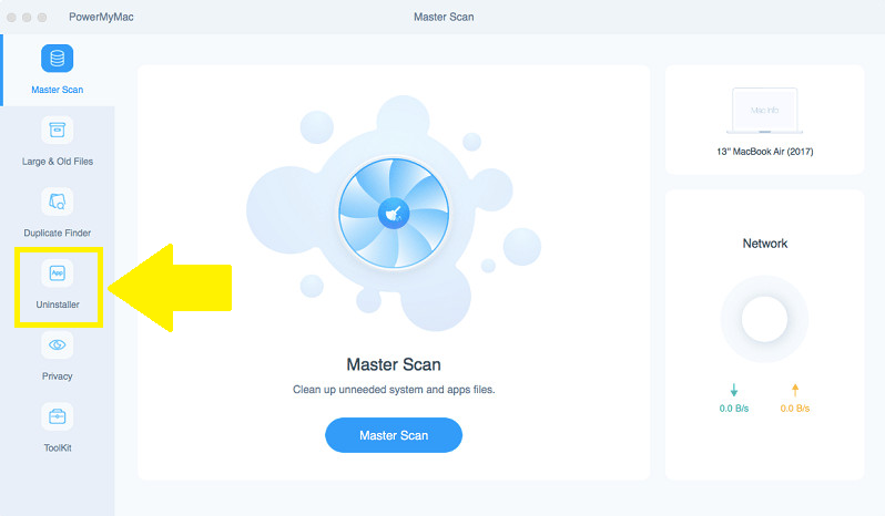Laden Sie PowerMyMac herunter. Starten Sie das Programm. Klicken Sie auf „Deinstallationsprogramm.“