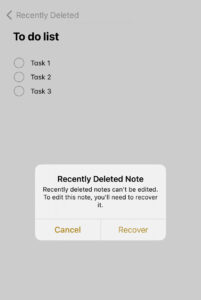 Jetzt, da die Notiz geöffnet ist, beginnen Sie mit der Bearbeitung. Dadurch wird ein Popup-Fenster von Apple geöffnet, in dem Sie gefragt werden, ob Sie diese Notiz wiederherstellen möchten. Klicken Sie an dieser Stelle auf „Wiederherstellen“. Sobald Sie auf „Wiederherstellen“ klicken, kehrt Ihre Notiz in ihren ursprünglichen Ordner zurück. Sie können es im Ordner „All iCloud“ sehen, wenn Sie Schwierigkeiten haben, es zu finden.