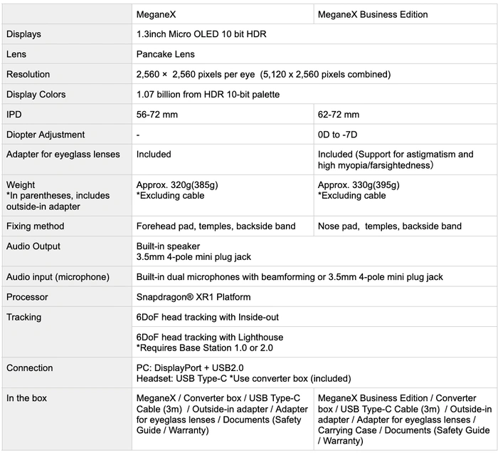 „Die MeganeX-Headsets werden weltweit die besten bieten höchstes Maß an Seherlebnis und schwarzem Ausdruck, das nur OLED bieten kann“, sagt das Unternehmen in einer Pressemitteilung. „Ein zusammenklappbarer Rahmen mit eingebauten Lautsprechern erleichtert das Mitnehmen. Es unterstützt 6DoF und lässt Sie eine Vielzahl von SteamVR-fähigen VR-Anwendungen genießen.“