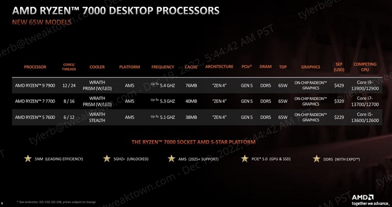 Die ursprünglichen Zen-4-Prozessoren hatten alle TDPs über 100 W, wobei einige näher an 200 W liegen, was sie für Builds mit kleinem Formfaktor eher ungeeignet macht. Um diese Lücke zu schließen, hat AMD drei neue Prozessoren mit einer TDP von 65 W für diejenigen herausgebracht, die nach einer weniger gerösteten Bauweise suchen. Ryzen 5 7600, Ryzen 7 7700, Ryzen 9 7900 haben alle die gleiche TDP, unterstützen DDR5 und werden entweder mit dem Wraith Stealth-oder dem Wraith Prism-Kühler in der Verpackung geliefert.