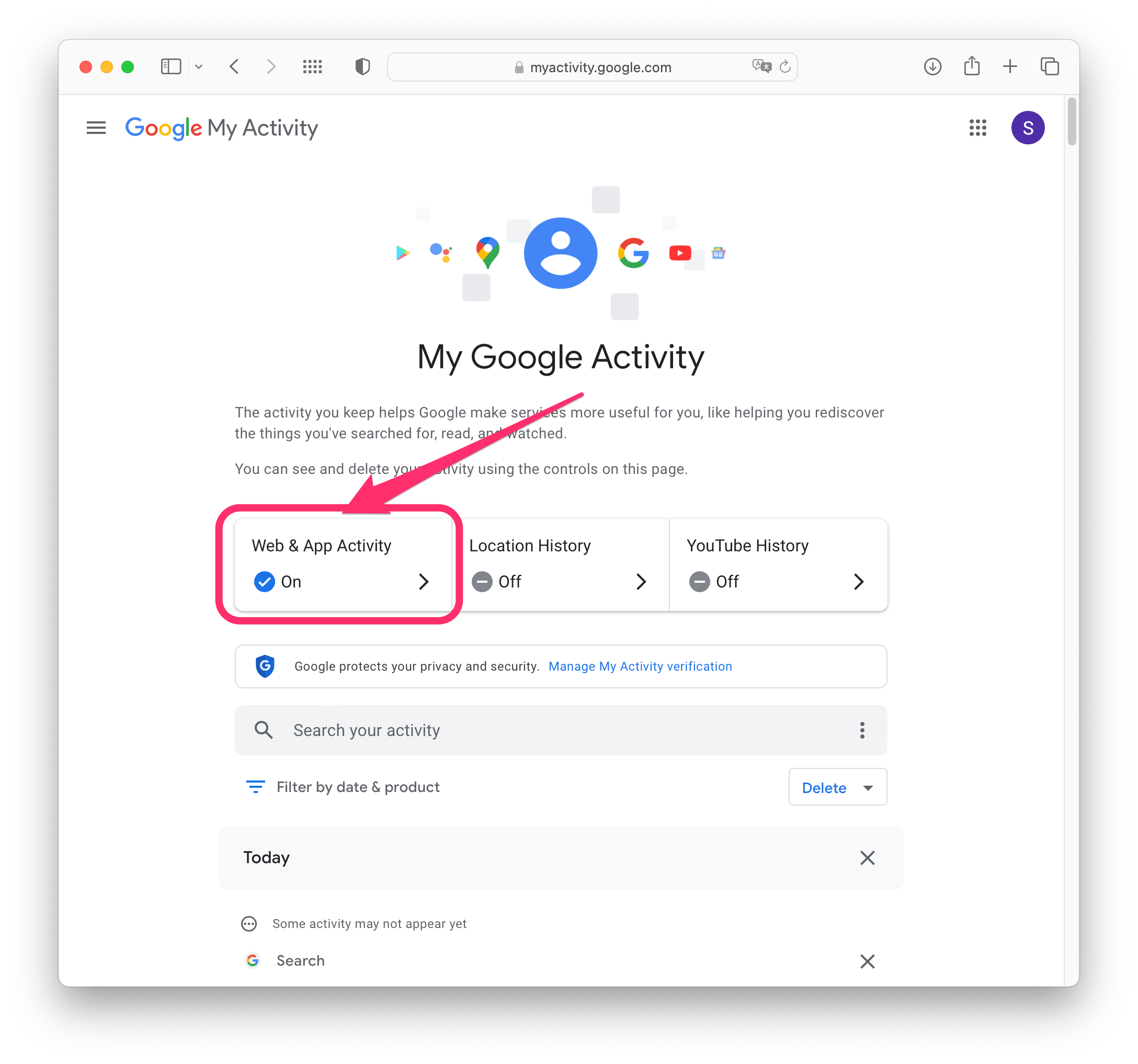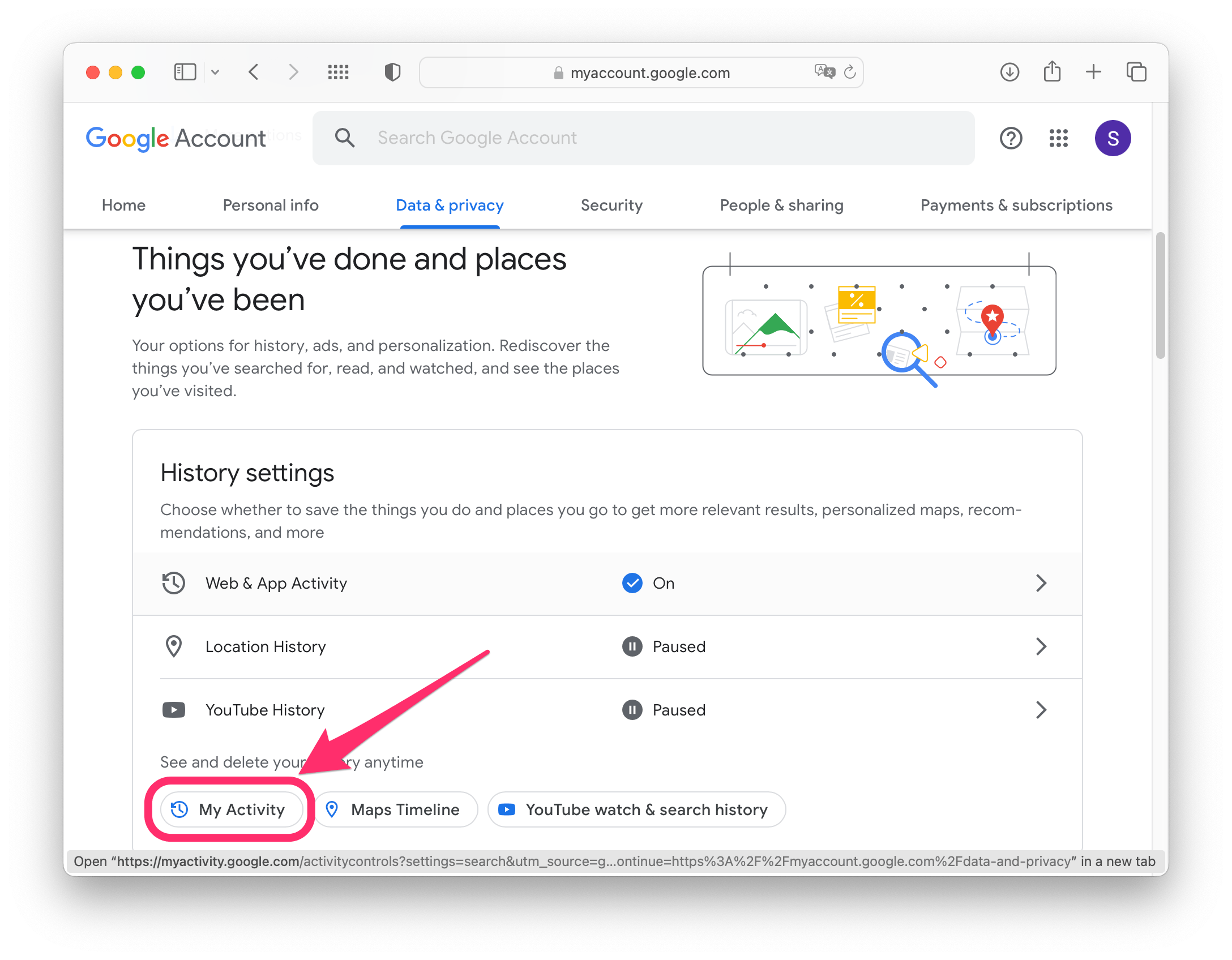 Öffnen Sie einen Browser wie Safari und gehen Sie zu Ihrem Google-Konto unter myaccount.google.com. Wählen Sie Daten & Datenschutz entweder im oberen Menü oder im seitlichen Menü (je nach Ansicht). Wählen Sie im Abschnitt Verlaufseinstellungen die Schaltfläche Meine Aktivitäten aus.