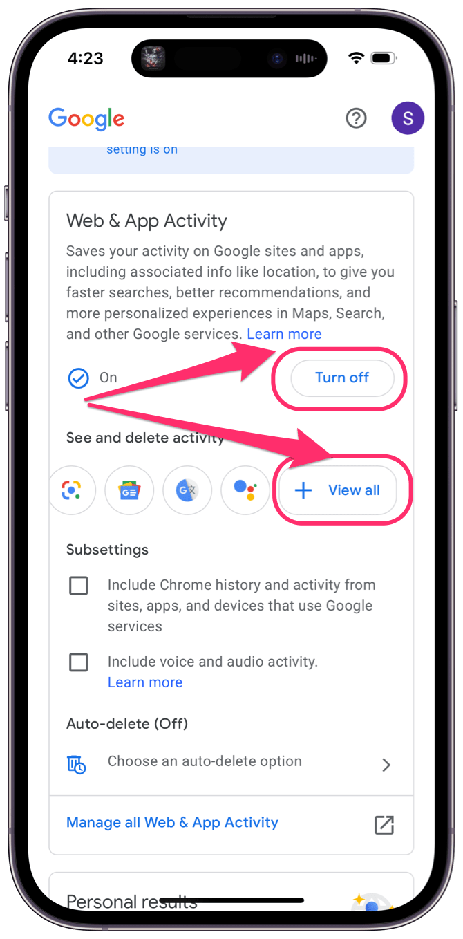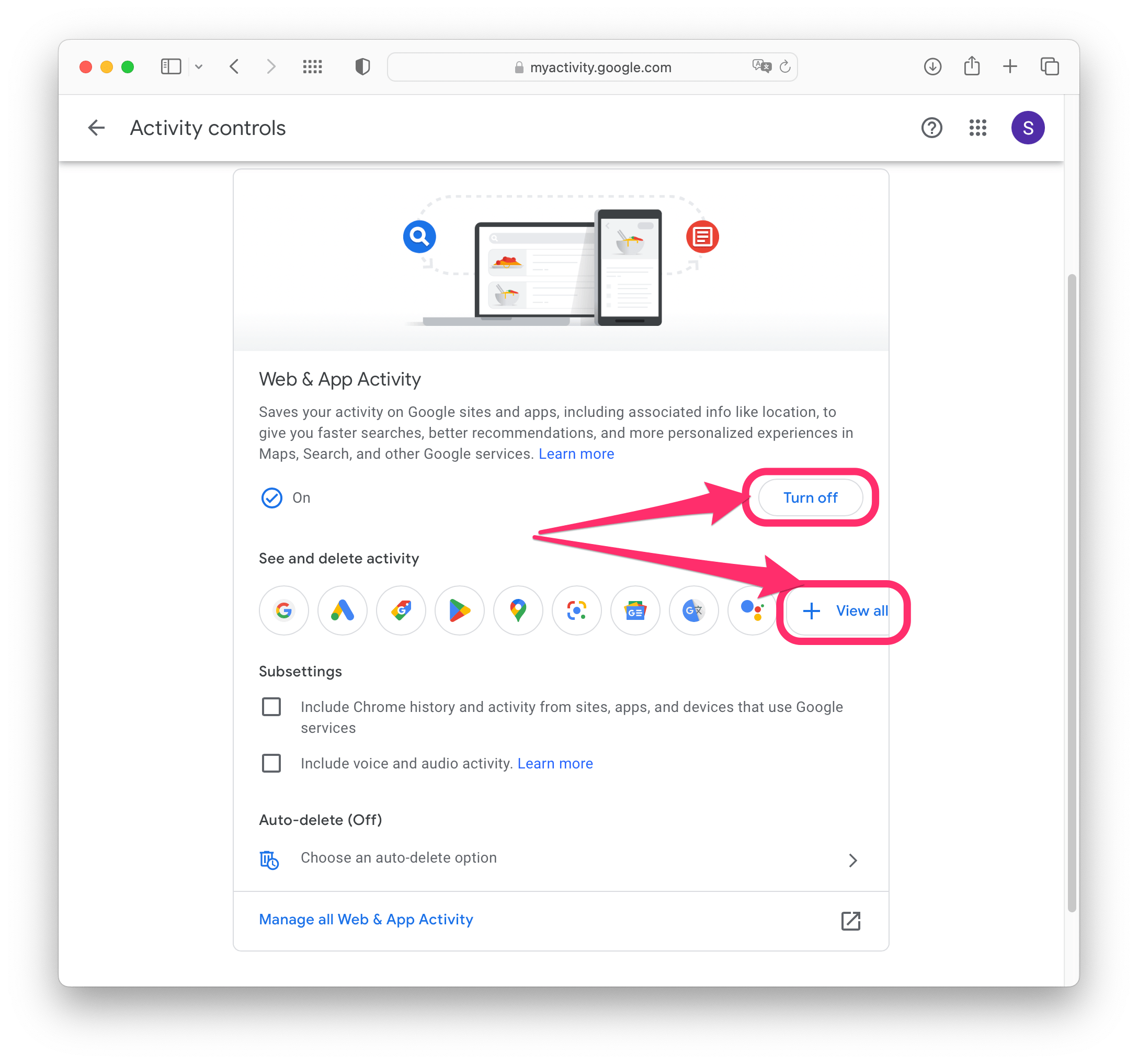 Von hier aus können Sie alles tun Folgendes: Sie können Web-und App-Aktivitäten mit der Schaltfläche Deaktivieren deaktivieren. Sie können Ihre Aktivitäten per App sehen und löschen; Wählen Sie einfach das App-Symbol aus. Sie können auch die Schaltfläche Alle anzeigen auswählen, um alle Ihre Aktivitäten anzuzeigen.