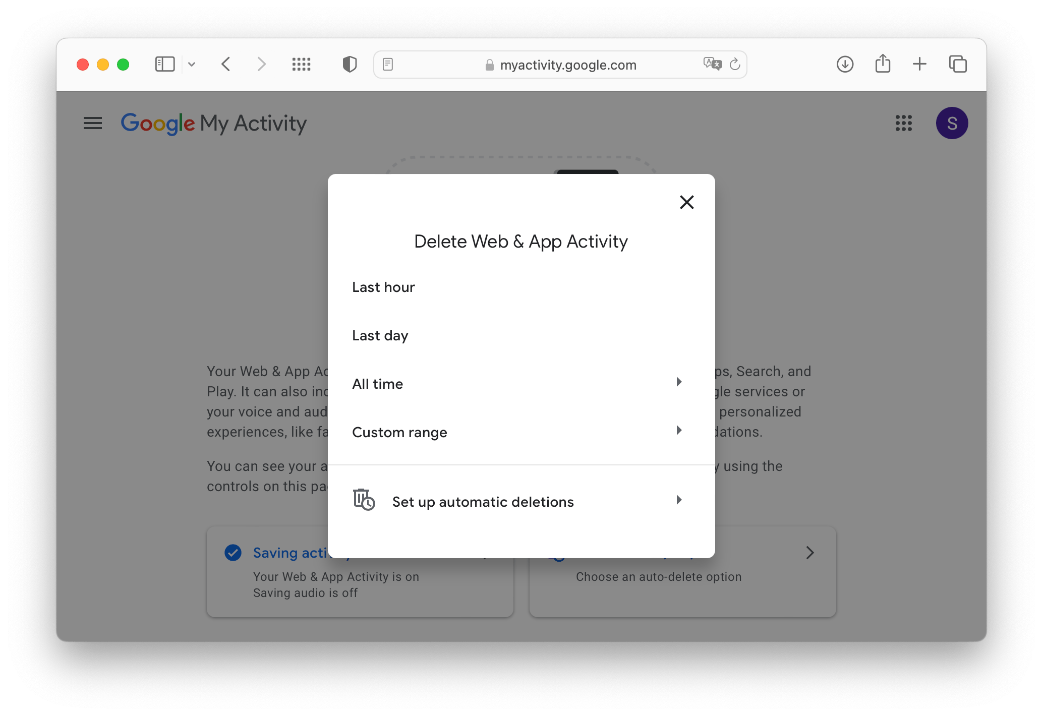 Beim Anzeigen einer Aktivitätsliste Wählen Sie die Schaltfläche „Löschen“, um ein Menü mit Optionen zu öffnen. Sie können Aktivitäten aus Letzte Stunde, Letzter Tag, Gesamte Zeit löschen oder einen benutzerdefinierten Bereich auswählen.