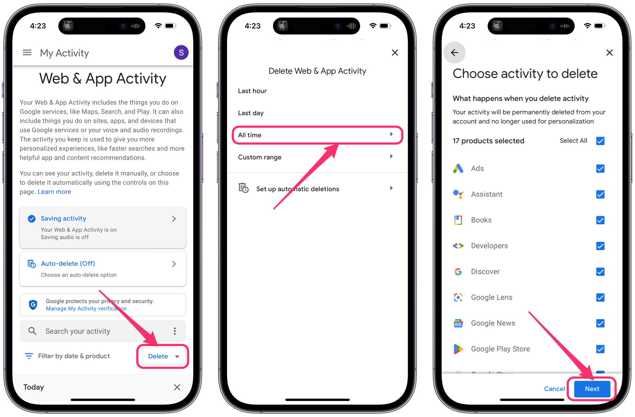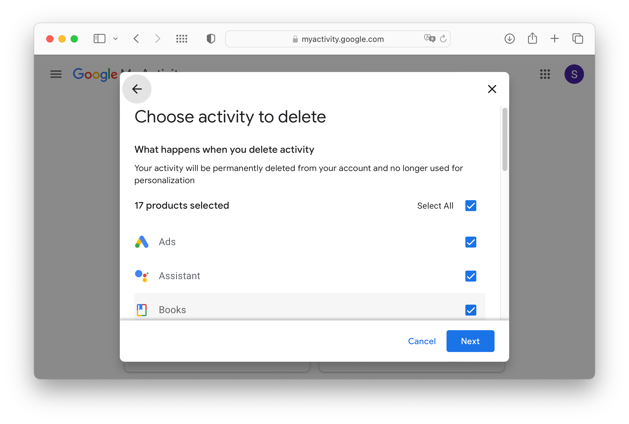 Wenn Sie eine Aktivitätsliste anzeigen, Wählen Sie die Schaltfläche Löschen, um ein Menü mit Optionen zu öffnen. Sie können Aktivitäten aus Letzte Stunde, Letzter Tag, Gesamte Zeit löschen oder einen benutzerdefinierten Bereich auswählen. Sie können auswählen, für welche Produkte Sie den Verlauf löschen möchten, und dann Weiter auswählen. Wählen Sie zur Bestätigung Löschen aus.