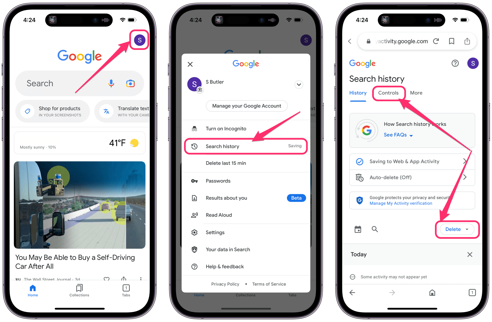 Über die Google-App auf dem iPhone oder iPad , tippen Sie oben rechts im Fenster auf Ihre Kontoschaltfläche. Tippen Sie auf Suchverlauf. Jetzt können Sie einen der folgenden Schritte ausführen: Tippen Sie auf die Schaltfläche Löschen und wählen Sie dann Heute löschen, Benutzerdefinierten Bereich löschen, Alle Zeiten löschen oder Automatisch löschen (um es zu aktivieren), um Ihren Verlauf zu löschen. Tippen Sie im oberen oder seitlichen Menü auf Steuerung.