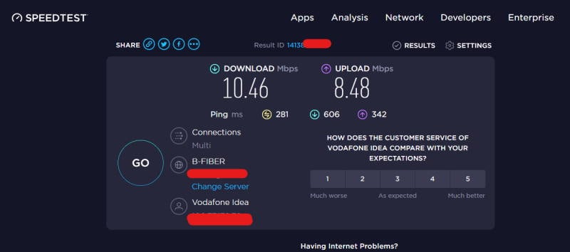 Um jedoch die Geschwindigkeit Ihrer Verbindung zu überprüfen, müssen Sie einen Geschwindigkeitstest durchführen mit jedem gewünschten Werkzeug. Es wird empfohlen, Speedtest von Ookla zu verwenden, um bessere Ergebnisse zu erzielen (Ping, Upload-Geschwindigkeit, Download-Geschwindigkeit usw.).