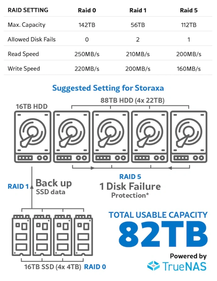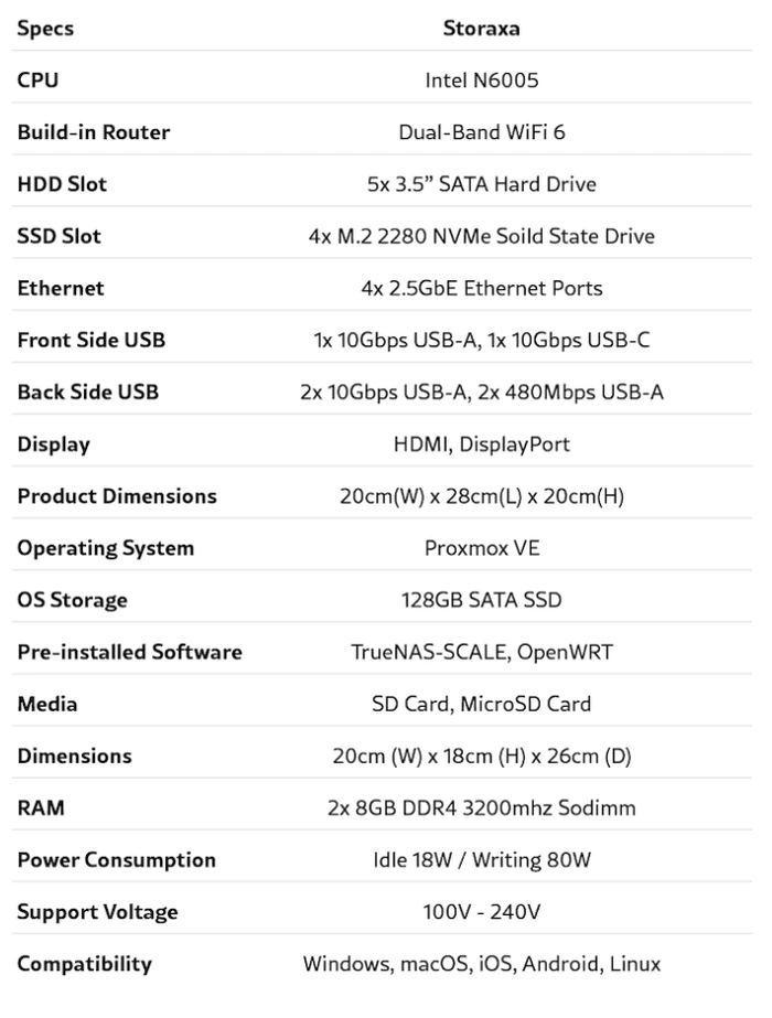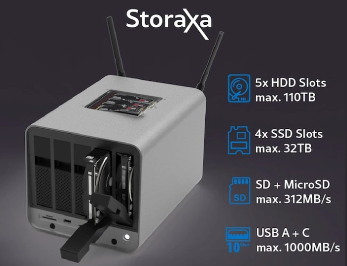 Storaxa ist ein neues Heim-Cloud-Speichersystem, das diesen Monat von Kickstarter eingeführt wurde und dank fast 500 Unterstützern bereits über 150.000 US-Dollar gesammelt hat, wobei noch 32 Tage verbleiben. Mit RAID 0, 1,5, 6, 10 zusammen mit Konnektivität über 2,5 GbE und WiFi 6 ist das NAS vollständig Open Source und wird von TrueNAS-SCALE und OpenWRT betrieben, sodass Sie die volle Kontrolle darüber haben, wie Ihre Daten wiederhergestellt werden. Ohne auf Dienste von Drittanbietern angewiesen zu sein.