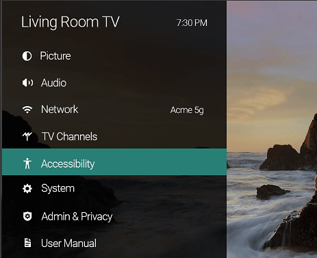 Drücken Sie “MENU” auf Ihrer VIZIO-Fernbedienung. Öffnen Sie “System”. Wählen Sie “Barrierefreiheit.“