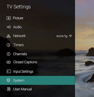 Drücken Sie “MENÜ” auf Ihrer VIZIO Smart TV-Fernbedienung. Öffnen Sie “System.”