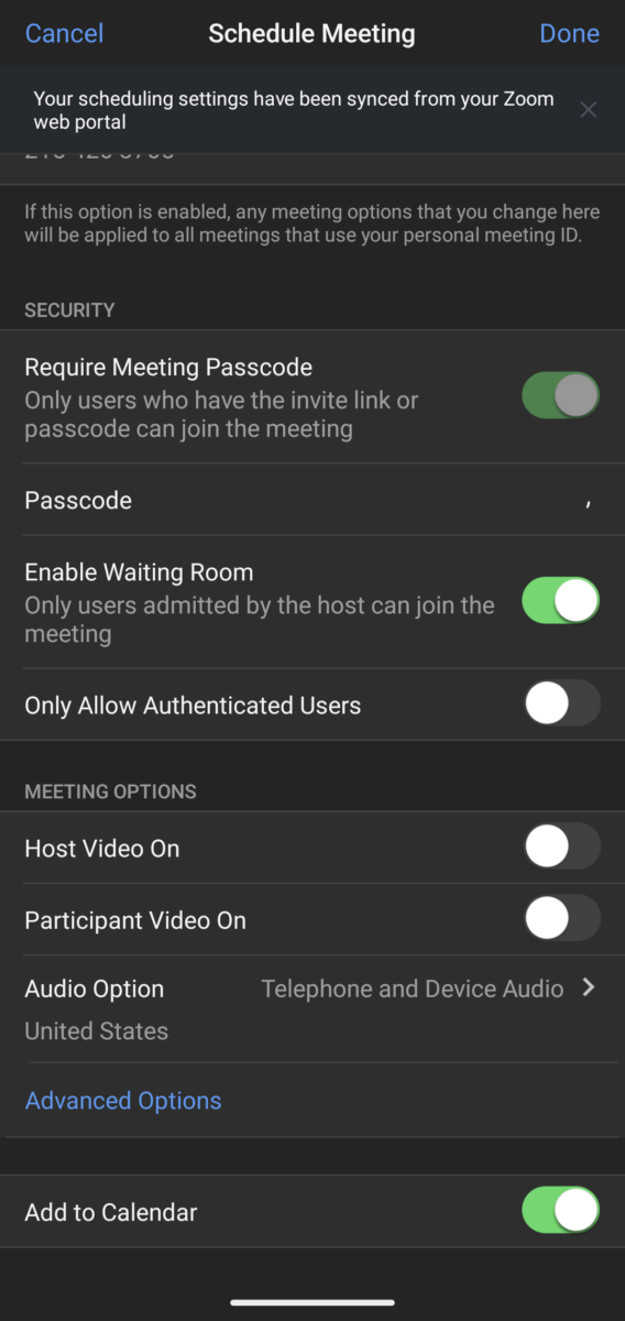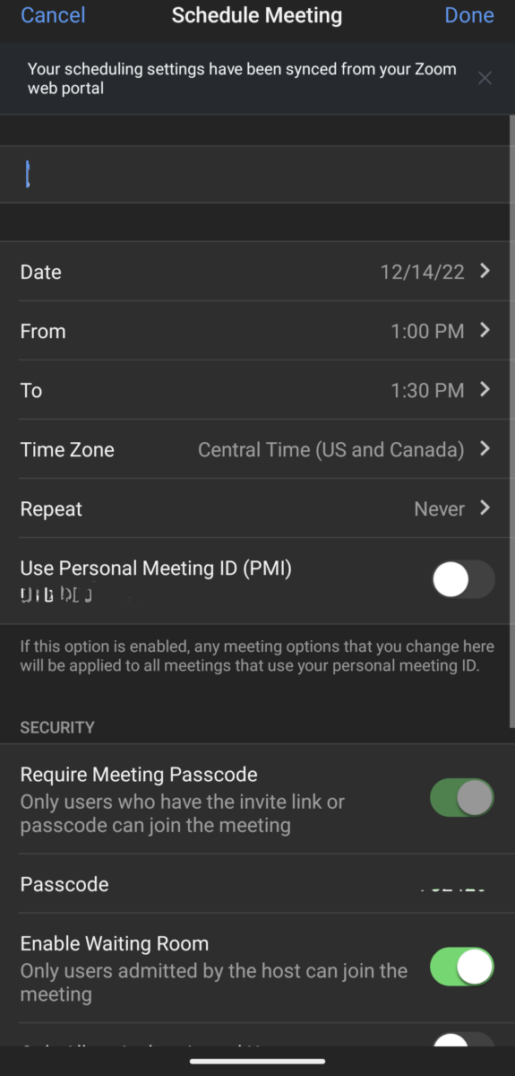 Zu guter Letzt , ist es genauso einfach, ein Zoom-Meeting auf Ihrem Telefon einzurichten wie auf Ihrem Computer. Sie müssen die Zoom-App haben und sich anmelden. Dann können Sie einfach auf die Schaltfläche „Zeitplan“ klicken. Ein neuer Bildschirm wird angezeigt und Sie füllen die erforderlichen Felder aus. Nachdem Sie dies getan haben, klicken Sie anstatt auf „Speichern“ auf die Schaltfläche „Fertig“ in der oberen rechten Ecke.