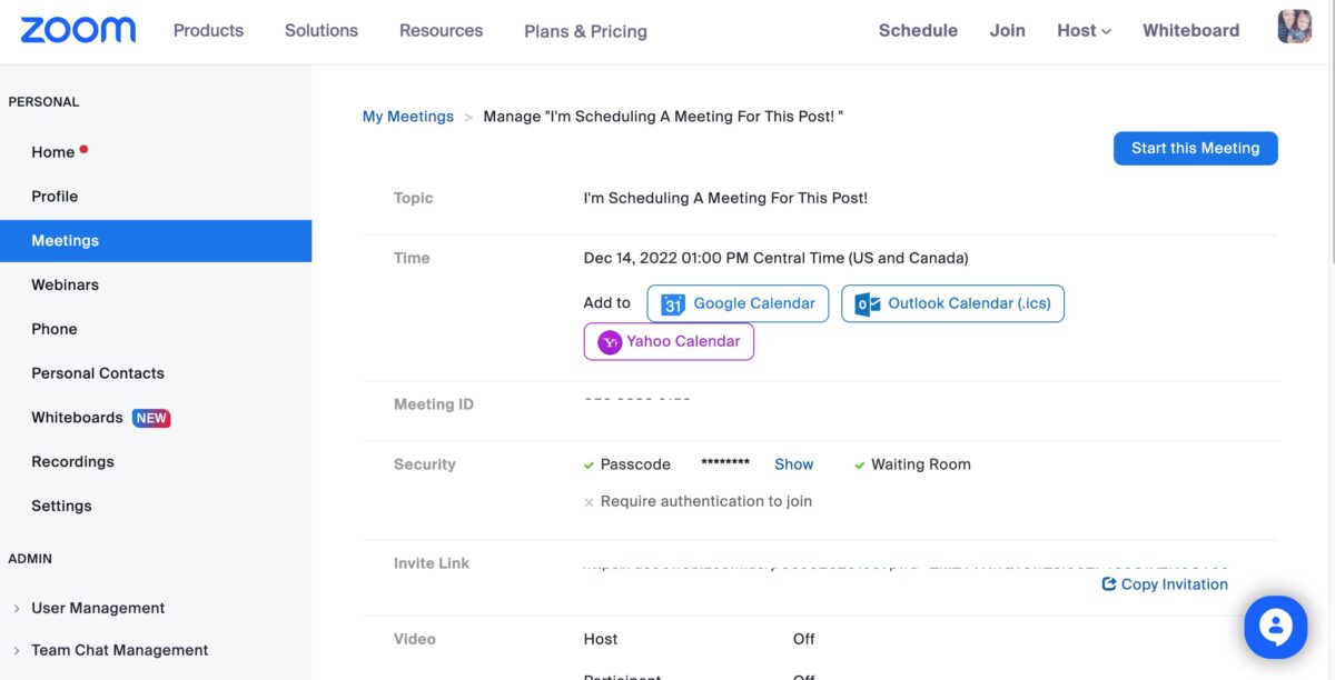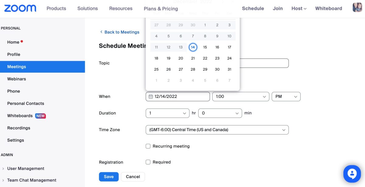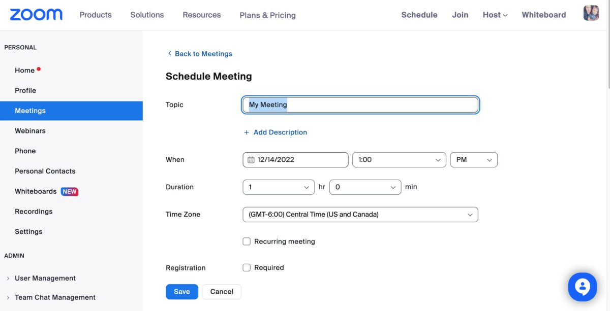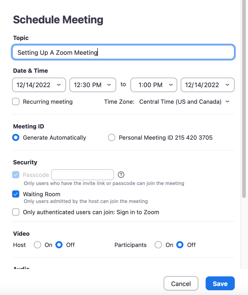 Jetzt ist es an der Zeit, Ihr Zoom-Meeting einzurichten. Es gibt viele erforderliche Abschnitte, die Sie ausfüllen müssen, bevor Sie den Anruf planen können. Dazu gehören:
